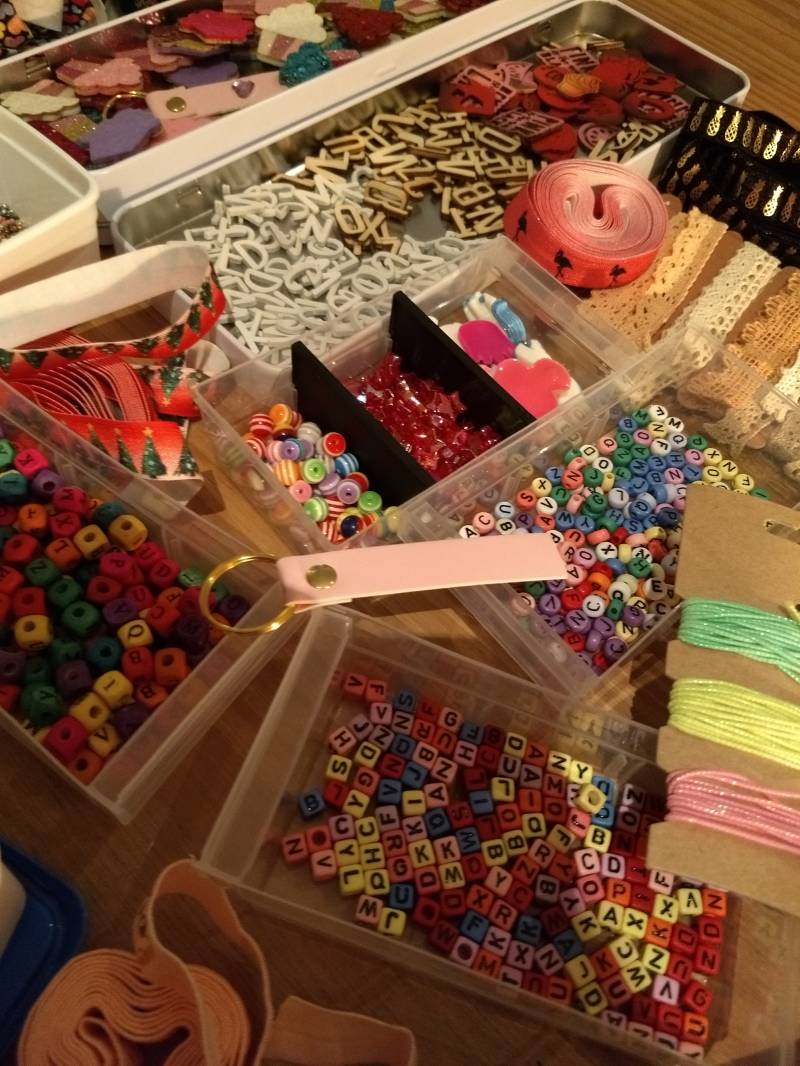 Impressie kralen, bedeltjes en glitters Verschillende soorten lint en elastiek Voorbeeld sleutelhangers Gekleurd kanten lint