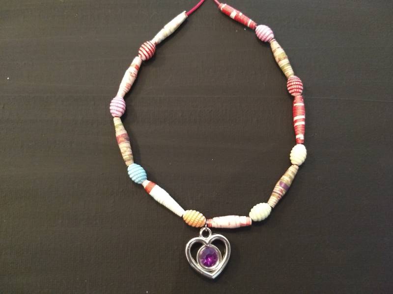 Een ontzettend leuke techniek om zelf een mooie ketting te maken is een ketting te maken van papieren kralen. Tussen de foto's zit hier een voorbeeld bij. De papieren kralen kunnen afgewisseld worden met andere kralen. Ook hierbij mogen de kinderen 1 bedel kiezen die aan de ketting komt te hangen.