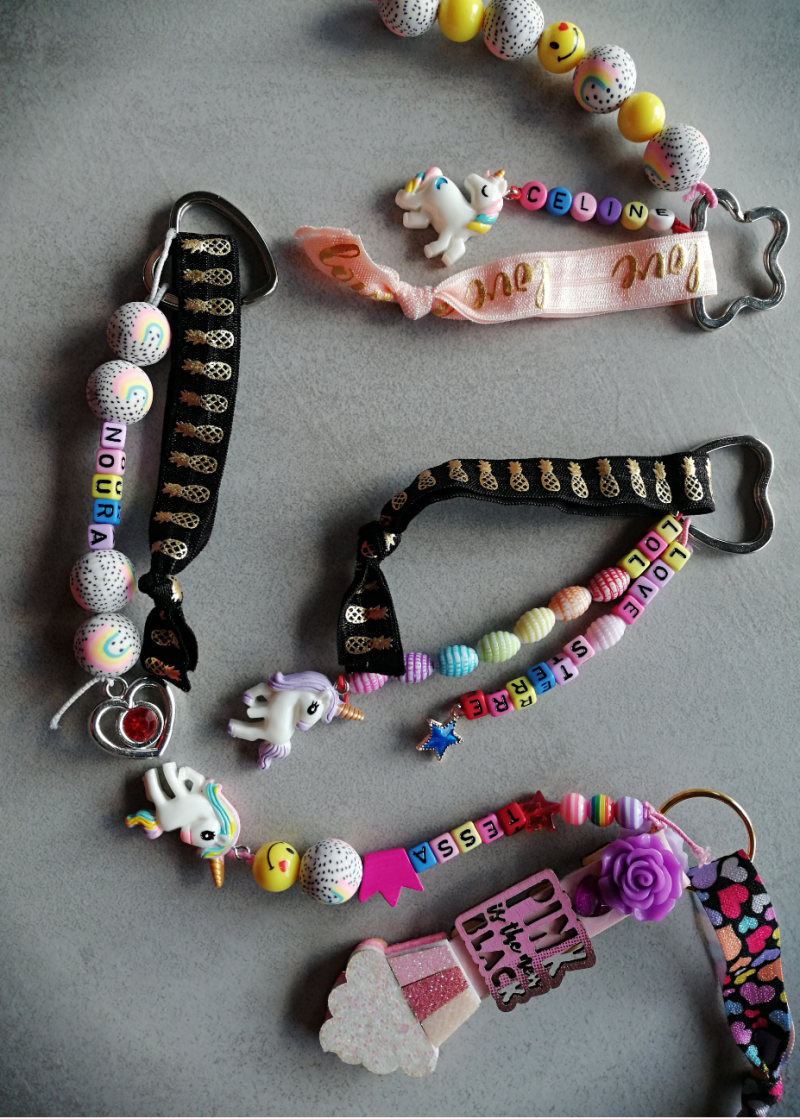 Kinderen kunnen kiezen uit verschillende hangers. Aan deze hangers mogen ze met kralen en koord/elastiek hun versiersel maken. Ook hierbij kan gekozen worden om hun eigen naam te maken in de sleutelhangers met letter kralen. Daarnaast mag er aan de hanger een bedel bevestigd worden. Ook mogen ze kiezen om aan de hanger een los elastiek / lint te bevestigen.